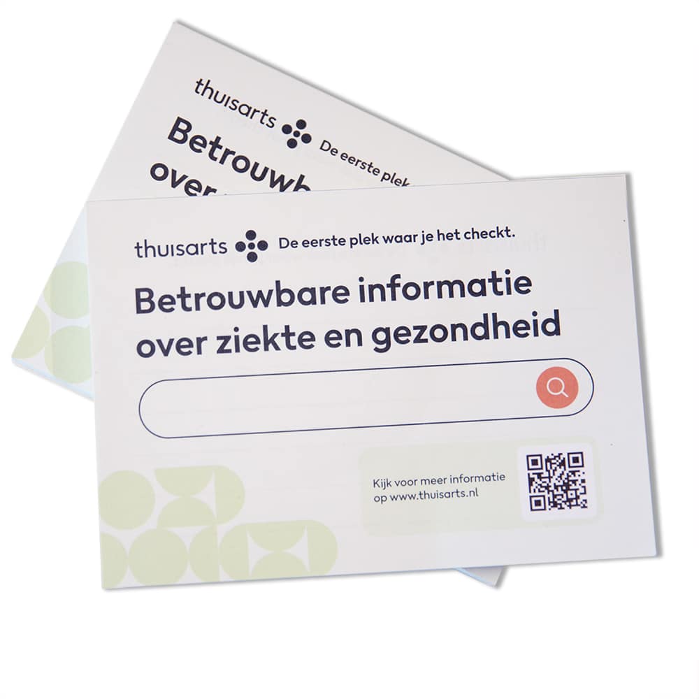 Zorg dat je patiënten thuis de informatie over hun klacht of aandoening nog eens rustig op Thuisarts kunnen nalezen. Met deze informatierecepten verwijs je de patiënt makkelijk en snel naar de juiste pagina op Thuisarts. Te bestellen per set van 8 blokjes.