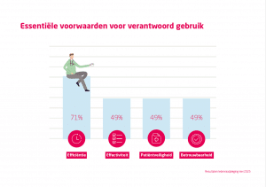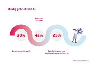 45% oriënteert zich op AI, 30% ziet momenteel geen behoefte. Een kwart van de respondenten gebruikt AI al, vooral voor administratie en verslaglegging. - Essentiële voorwaarden voor verantwoord gebruik