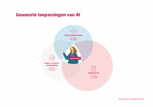 Van de huisartsen die AI al gebruiken (25%) zet het merendeel deze technologie in voor administratieve taken en verslaglegging. Juist op dit terrein wordt ook de grootste positieve impact verwacht. Daarnaast zien huisartsen potentie voor AI bij het stimuleren van zelfzorg en ter ondersteuning van de directe zorgverlening, zoals bij triage- en consultvoorbereiding en beslisondersteuning.